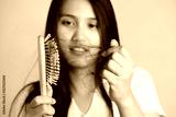 Healthy concept. Woman show her brush with damaged long loss hair and looking at her hair.