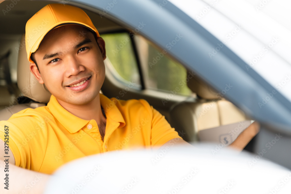 Happy delivery man in yellow polo shirt uniform with parcels cardboard box in car. Smiling courier Delivery man sitting in car and checking the delivery list.