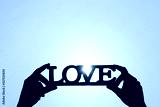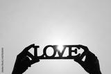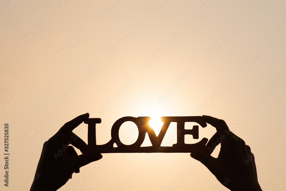Silhouette woman hands holding the word love at sunset background. love concepts.
