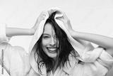 happy girl wiping wet clean hair with white towel isolated on white isolated on white