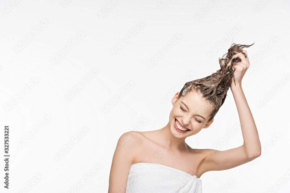 happy girl smiling with closed eyes while washing long hair isolated on white
