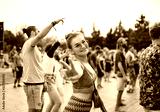 Beautiful young woman dancing at summer festival.