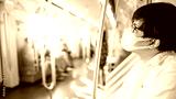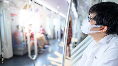 Asian man wearing surgical face mask sitting on skytrain or urban train. Wuhan coronavirus (COVID-19) outbreak prevention in public transportation. Health awareness for pandemic protection