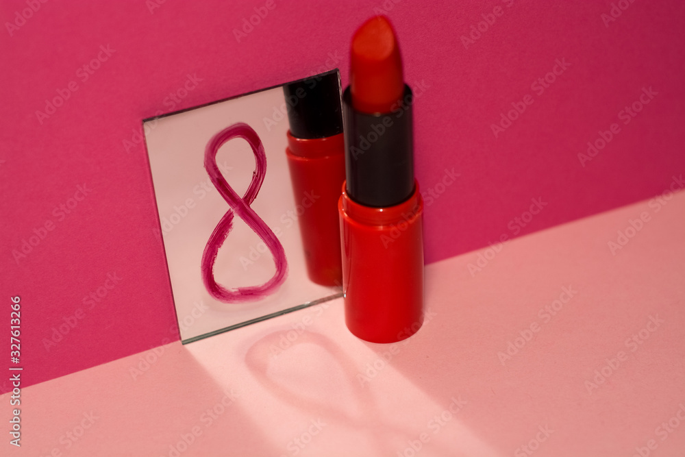 Red lipsticks and small mirror on bright pink background. Holiday is March eighth, day of women and spring.