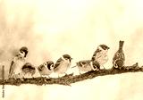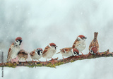 many small funny birds sparrows are sitting on a tree branch in winter garden under falling snowflakes