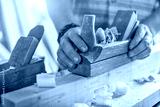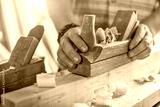 The carpenters using old spokeshave or plane to decorate the woodboard.