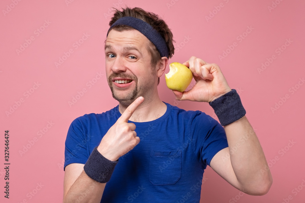 Fitness sport caucasian man eating apple isolated on a pink background.