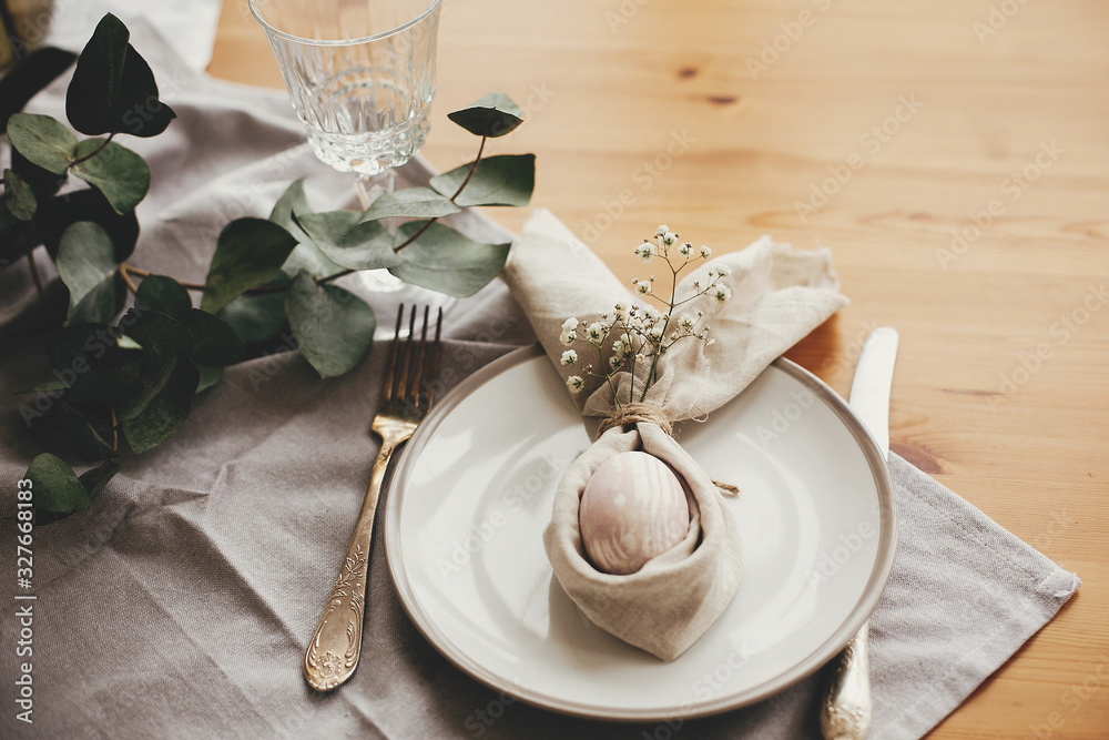 Stylish Easter brunch table setting with egg in easter bunny napkin on table. Modern natural dyed pink easter egg on napkin with bunny ears, flowers on plate and cutlery. Easter table decorations.
