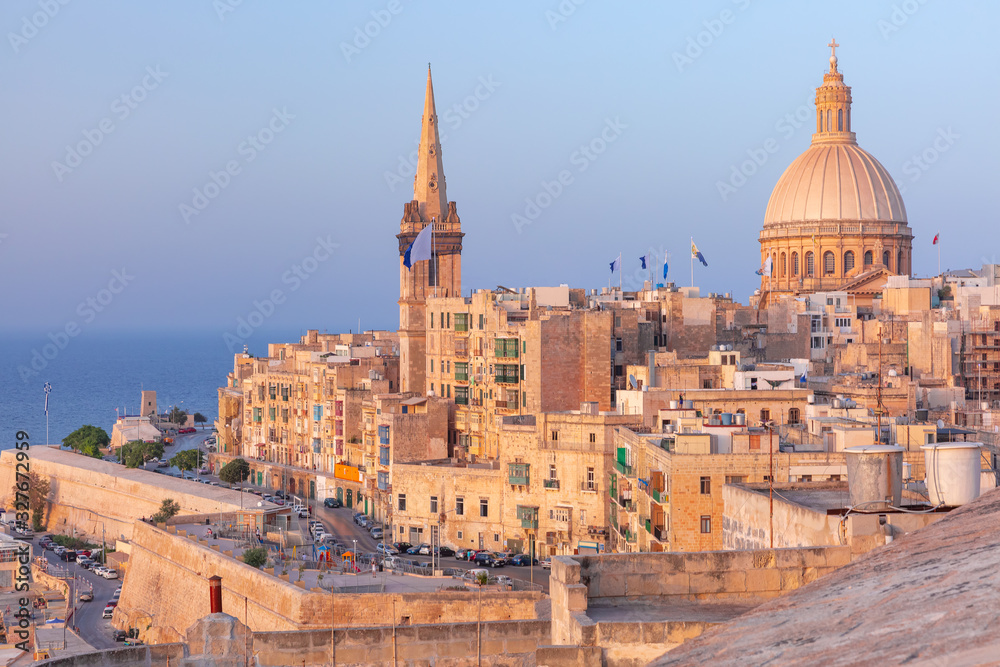 View of Old town roofs, fortress, Our Lady of Mount Carmel church and St. Paul's Anglican Pro-Cathedral at sunset , Valletta, Capital city of Malta