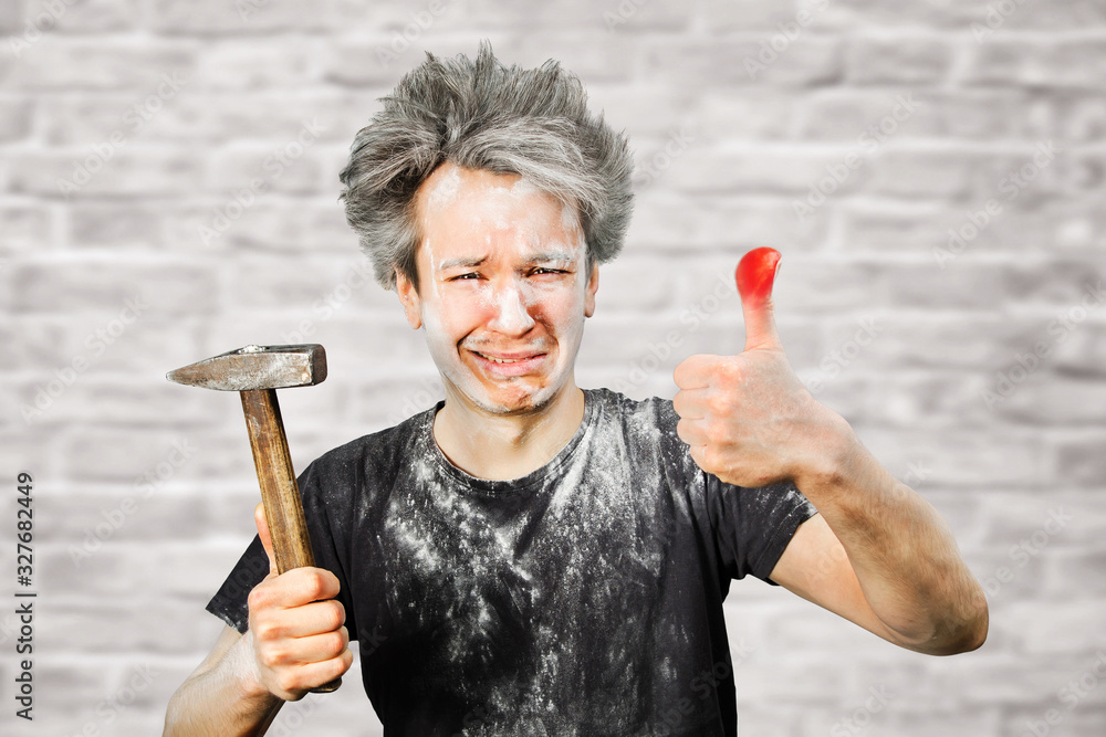 Dirty young builder guy fail is hold a hammer, hit the finger on brick wall background at home during repairs