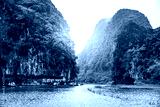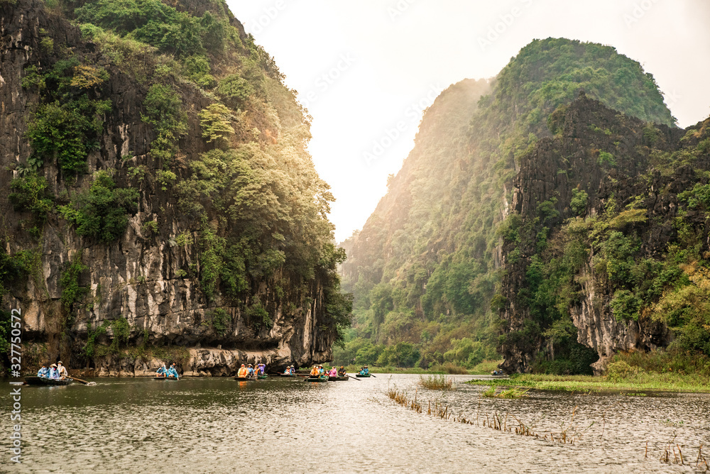 Tam Coc National Park - Tourists traveling in boats along the Ngo Dong River at Ninh Binh Province, Trang An landscape complex, Vietnam - Landscape formed by karst towers and rice fields