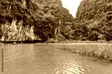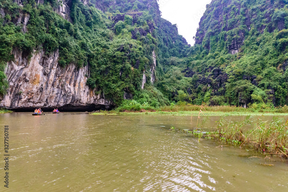 Tam Coc National Park - Tourists traveling in boats along the Ngo Dong River at Ninh Binh Province, Trang An landscape complex, Vietnam - Landscape formed by karst towers and rice fields