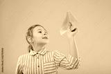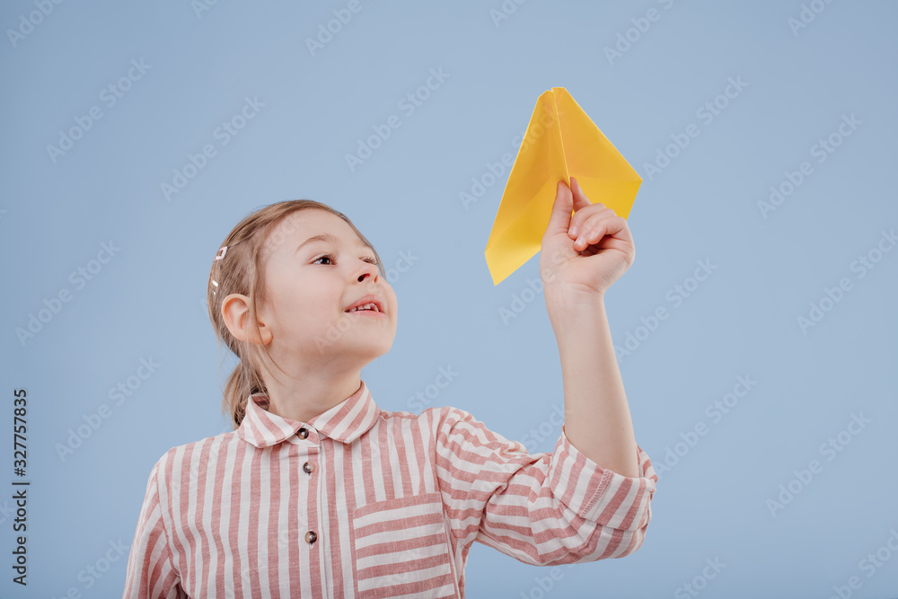 smiling little girl holds yellow paper plane in his hand, isolated on blue background, copy space
