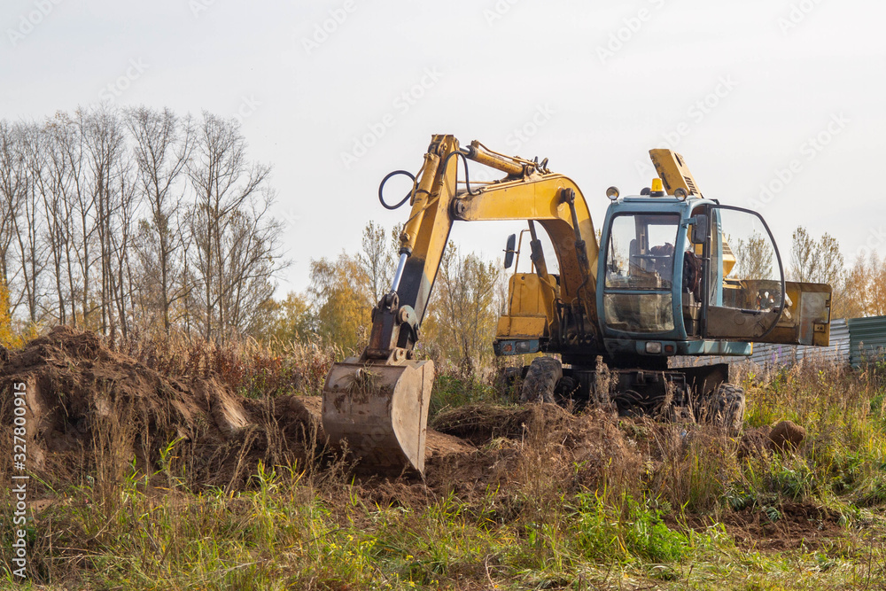 Excavator digs the ground with a bucket. Road-building. Autumn. Earthwork..