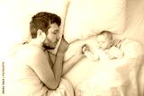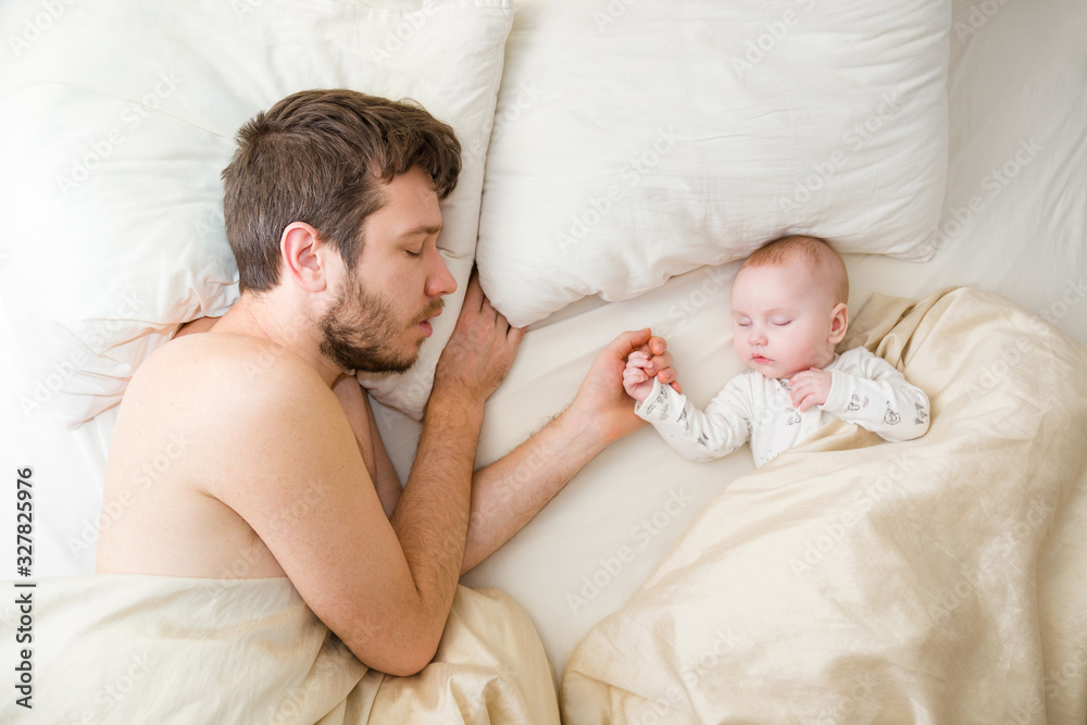 Baby and young father sleeping together in bed in morning. Lovely, emotional moment. Closeup.