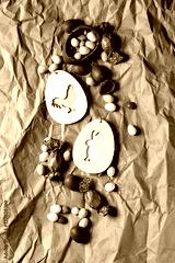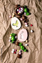 Easter greeting card with wooden rabbit and chicken decorations, chocolate sweets and eggs on crumpled craft paper background. Flat lay, copy space.