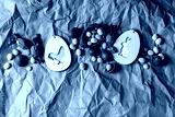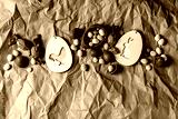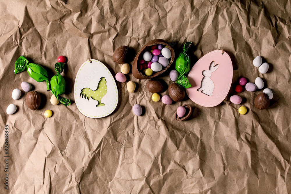 Easter greeting card with wooden rabbit and chicken decorations, chocolate sweets and eggs on crumpled craft paper background. Flat lay, copy space.