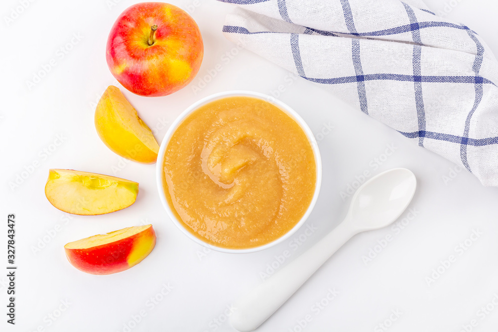 Fresh homemade applesauce. The concept of proper nutrition and healthy eating. Organic and vegetarian food. White bowl with fruit puree on fabric and cut apples on table. Baby food. Copy space for