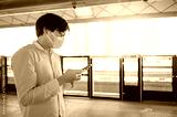 Asian man wearing surgical face mask using smartphone at skytrain station platform. Wuhan coronavirus (COVID-19) outbreak prevention in public transportation. Health awareness for pandemic protection