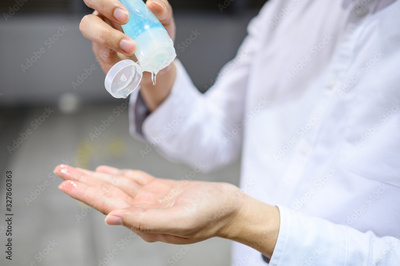 Male hand using hand skin sanitizer gel tube for washing hand at subway station. Health awareness for pandemic protection. Health care concept