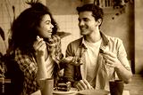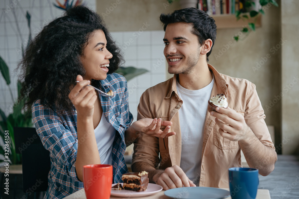 Happy multiracial friends communication together. Young lovely couple laughing, sitting in cafe. Beautiful African American woman and Indian man drinking coffee, eating tasty cake. First date concept