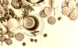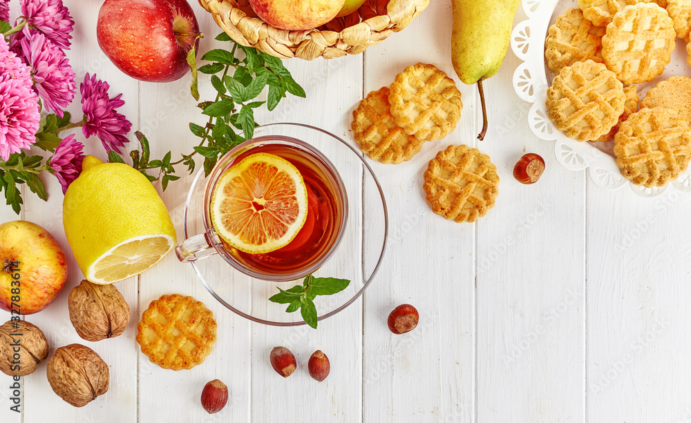 Tea with herbs fruits and cookies. Still life with hot drink apple and nuts at white wooden board in rustic style.