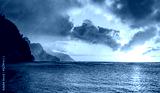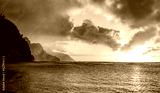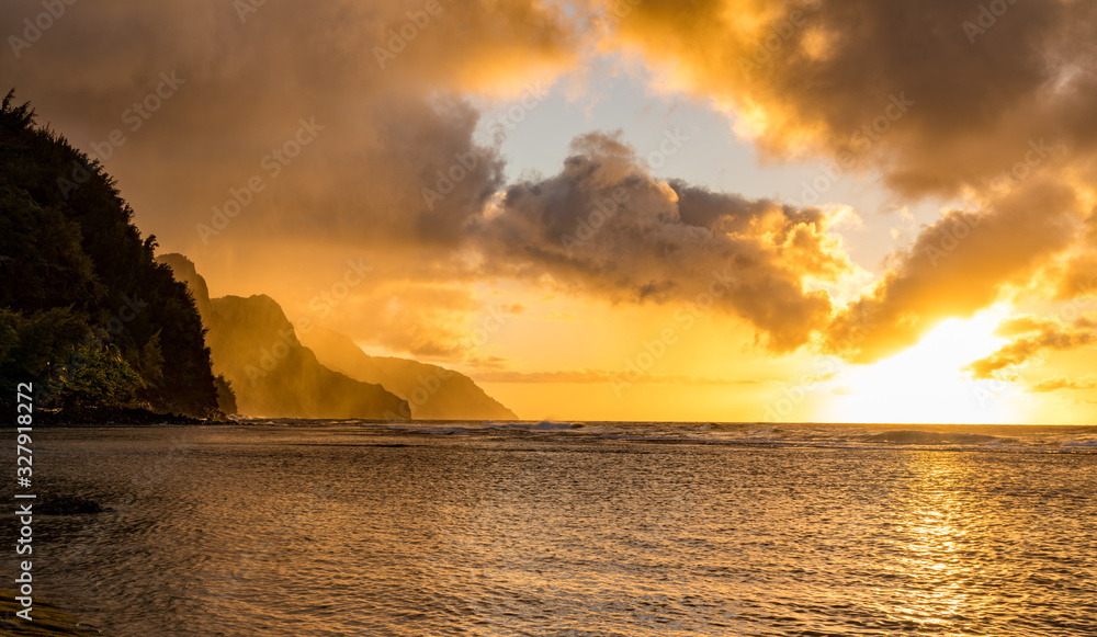 Sunset lights the receding cliffs of the NaPali coastline on north coast of Kauai in Hawaii