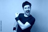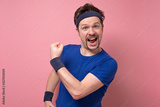 Training man expressing his excitement and delight by shouting Yes and clenching fists