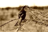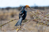 Closeup of a Southern yellow-billed hornbill - Tockus leucomelas- sitting on a branch of a tree in Etosha National Park, Namibia.