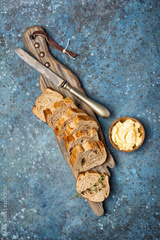 Slices of bread with butter in wooden bowl and vintage knife