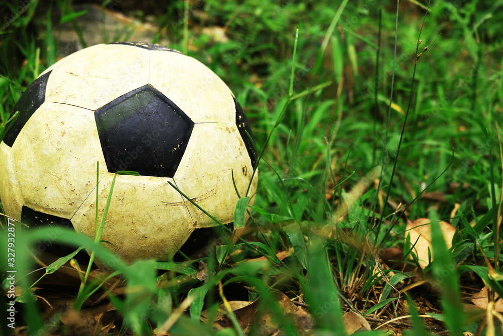 Close up image of dirty football or soccer ball on grass and leaf ground image