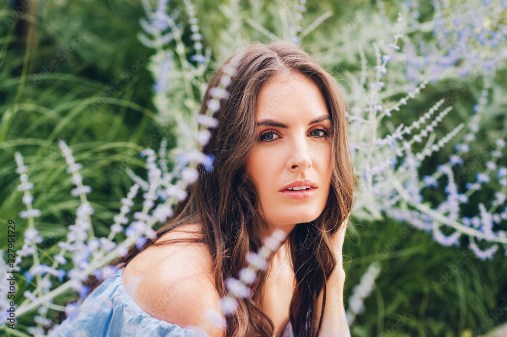 Outdoor close up portrait of pretty young woman with dark hair posing in summer garden with purple flowers