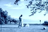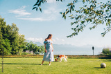 Young beautiful woman relaxing in summer garden, playing with a dog