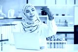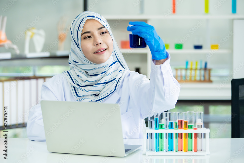 Asian young Muslim scientist testing the chemical experiment in hospital laboratory. Professional scientific pharmaceutical chemist investigating and making experiment in laboratory.