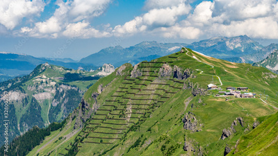 Switzerland, Panoramic view on Berghaus Männlichen and green Alps around