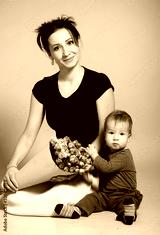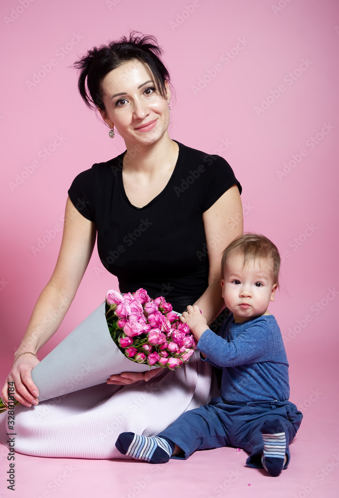 Cute little son with her mother holding a bouquet of tulips. Mother's day, March 8.