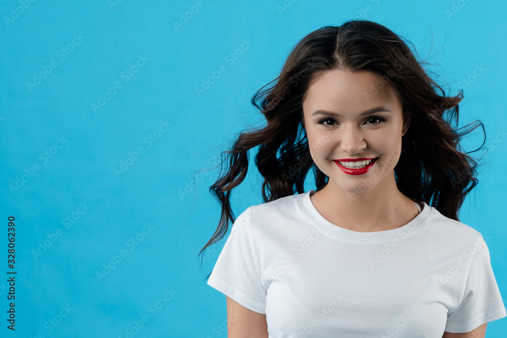 Young beautiful girl looking at the camera and smiling. Lady develops hair from the wind. She has a flawless, dazzling smile. The concept of fashion, beauty, advertising, models, emotions