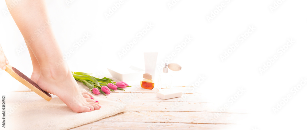 Young woman at SPA pedicure, using a foot file. Beauty legs, feet, heel. Wide view with copyspace.