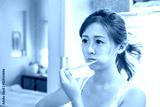 Beautiful young girl brushing teeth in front of her bathroom mir
