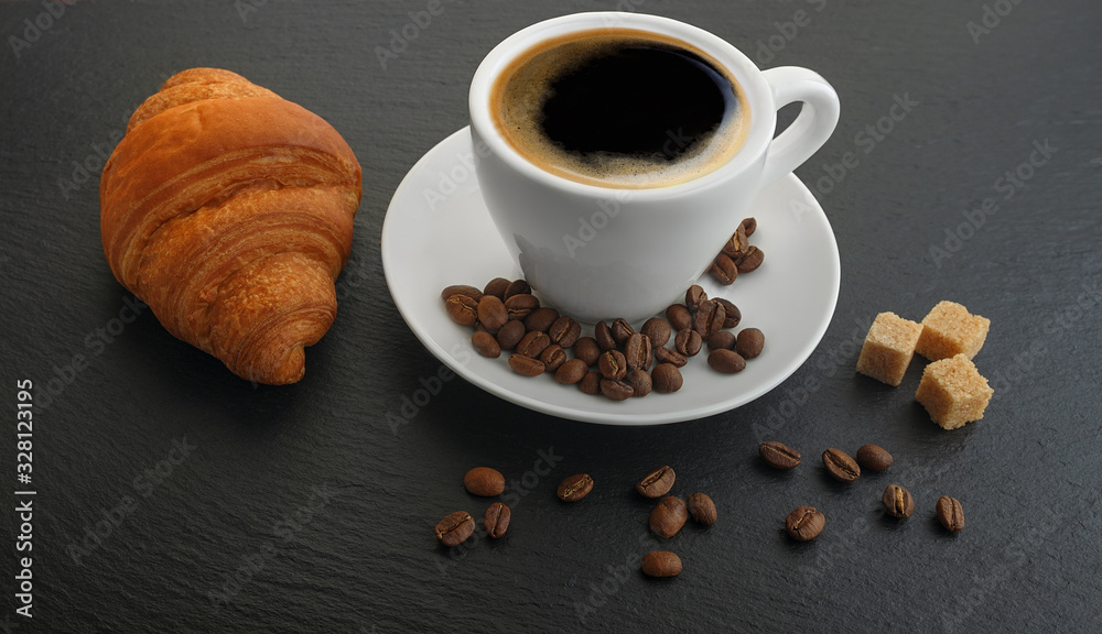 white cup with coffee and coffee grains cookies on black slate blackboard