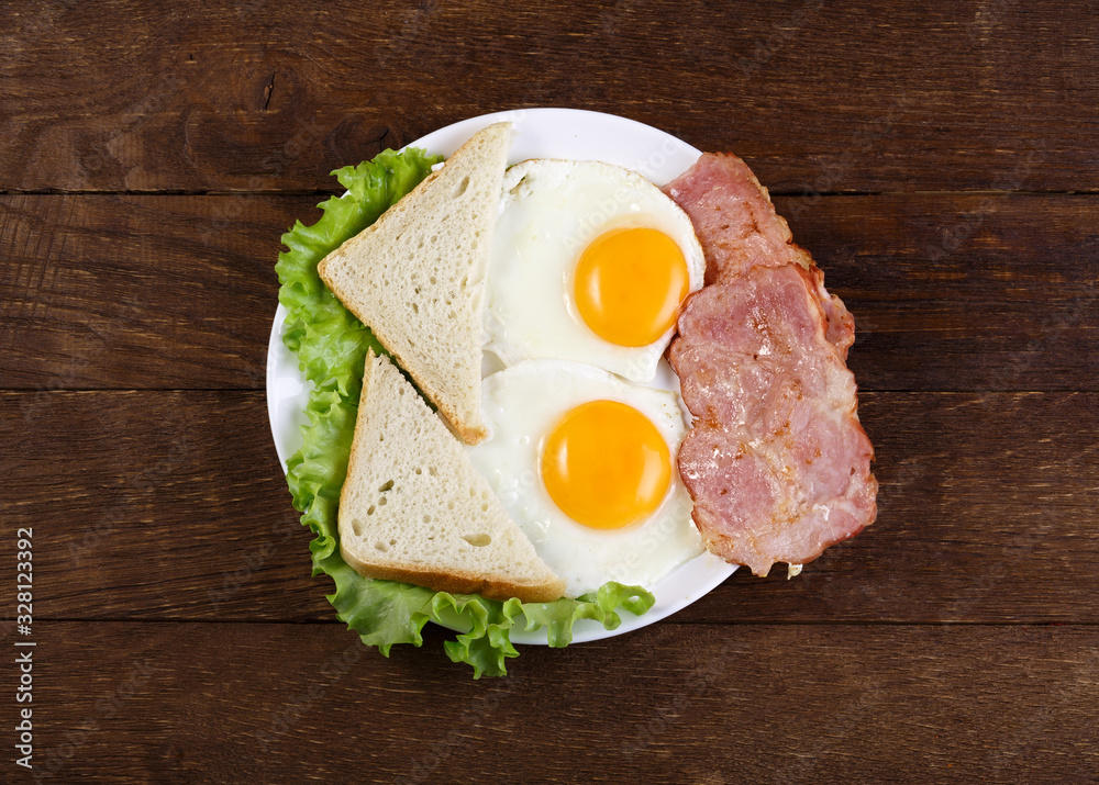fried eggs breakfast toast salad on wooden