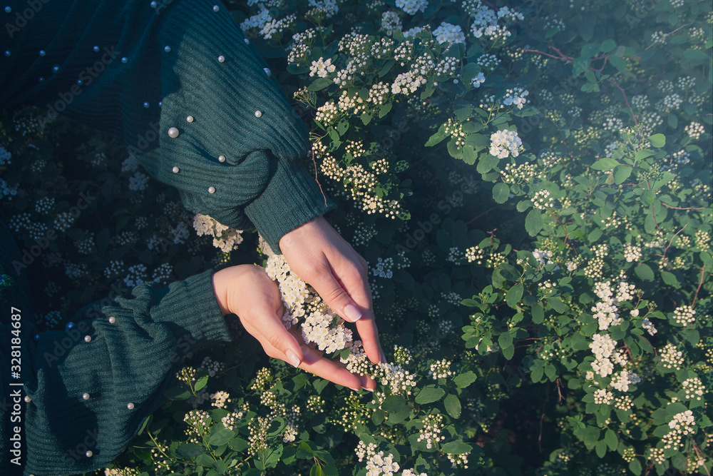 Female hands and spirea flowers illuminated by sunlight. Nature