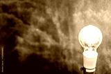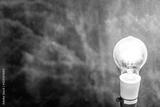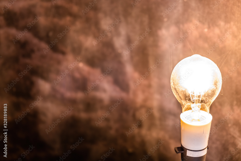 Old dusty lightbulb shining light against blurred decaying wall with copy space