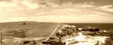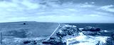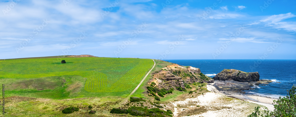 Panoramic landscape of green agricultural field near ocean rugged coastline
