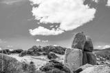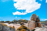 Large orange rocks and native Australian shrubs against vivid blue sky and white clouds