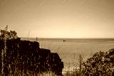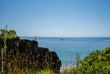 Coastal landscape - tall grass over rocks with small fishing boat in the ocean under clear blue sky in Australia