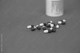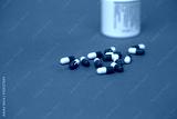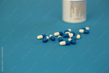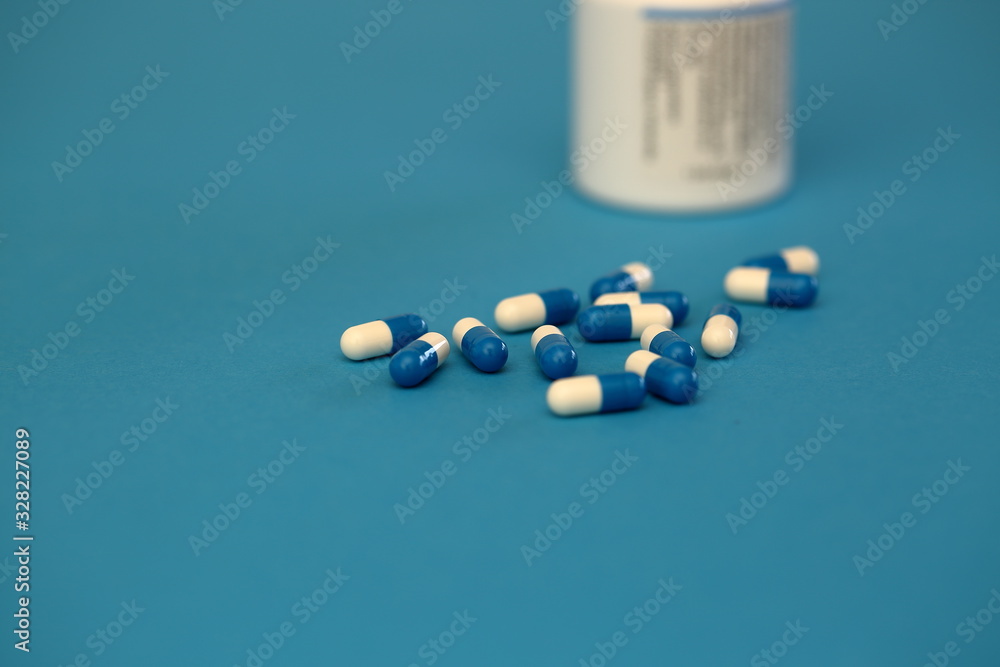 Pills capsules tablets antibiotic lie on blue background, behind plastic pharmacy bottle in soft focus