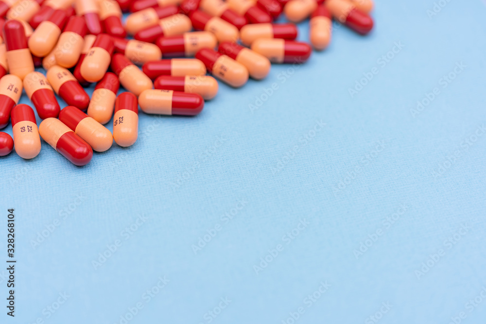 Medicine pills or capsules on blue background with copy space. Medicinal prescription for drug treatment. Pharmaceutical drug, medicine in container for health. Sale of antibiotic in pharmacy.
