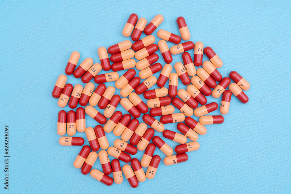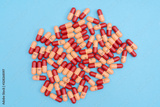 Medicine pills or capsules on blue background with copy space. Medicinal prescription for drug treatment. Pharmaceutical drug, medicine in container for health. Sale of antibiotic in pharmacy.