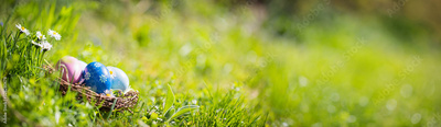 Nest with easter eggs in grass on a sunny spring day - Easter decoration, banner, panorama, background